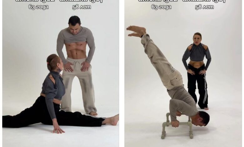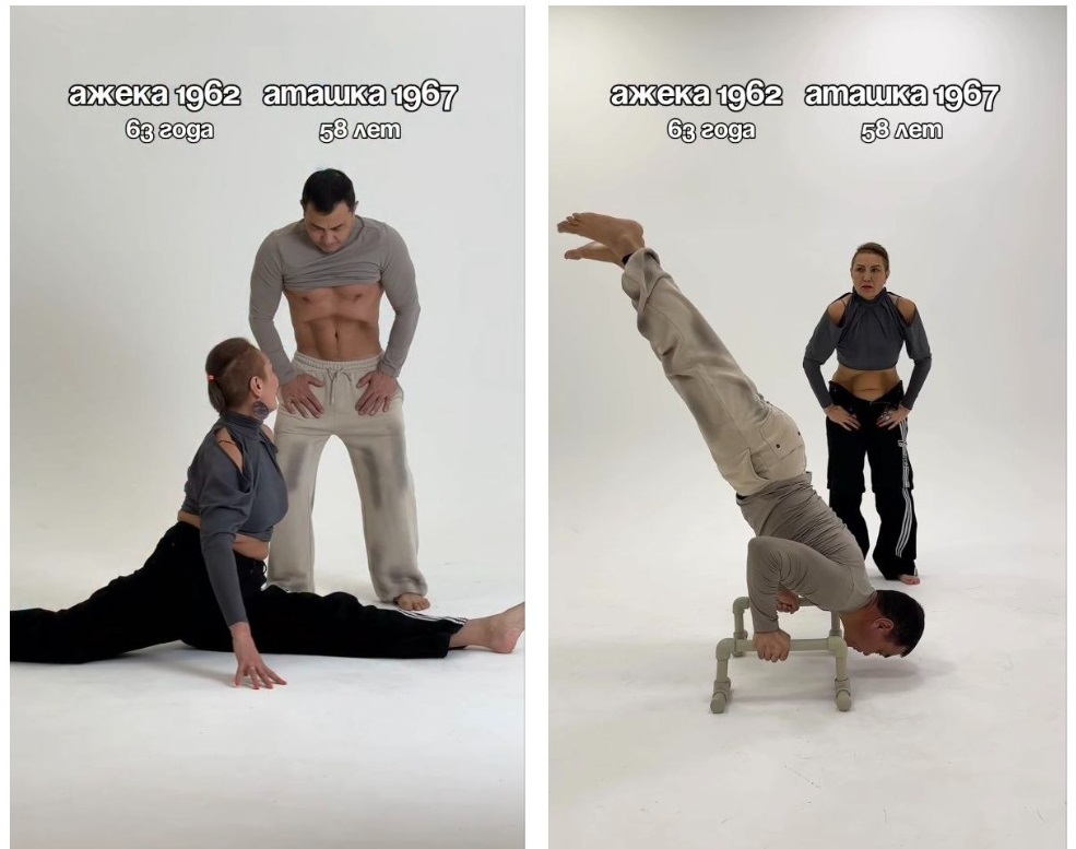 Видеода 58 жастағы ер адам мен 63 жастағы әйел әртүрлі жаттығу жасап, өздерінің физикалық әлеуетін көрсетеді.