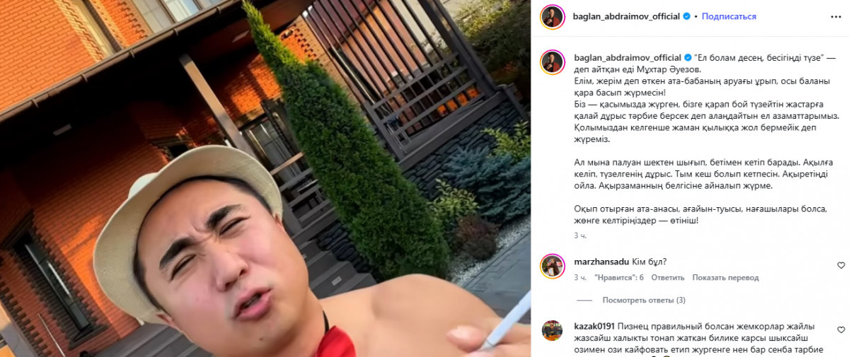 Ел болам десең, бесігіңді түзе” деп айтқан еді Мұхтар Әуезов. Елім, жерім деп өткен ата-бабаның аруағы ұрып, осы баланы қара басып жүрмесін! Біз – қасымызда жүрген, бізге қарап бой түзейтін жастарға қалай дұрыс тәрбие берсек деп алаңдайтын ел азаматтарымыз. Қолымыздан келгенше жаман қылыққа жол бермейік деп жүреміз. Ал мына палуан шектен шығып, бетімен кетіп барады. Ақылға келіп, түзелгенің дұрыс. Тым кеш болып кетпесін. Ақыретіңді ойла. Ақырзаманның белгісіне айналып жүрме. Оқып отырған ата-анасы, ағайын-туысы, нағашылары болса, жөнге келтіріңіздер, өтініш! – деп жазды әнші.
