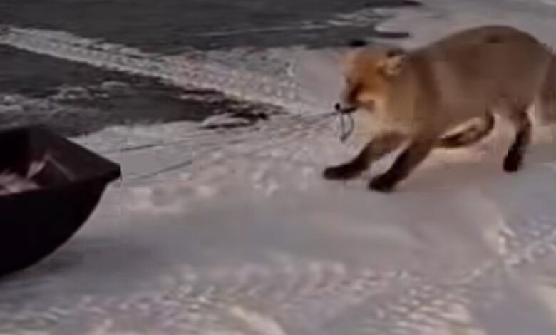 Түлкі жемтікті тартып әкетуге тырысқанымен балықшылар ұстаған балықтарын бермеді. Бірнеше сәтсіз әрекеттен кейін түлкі шегінуге мәжбүр болған.