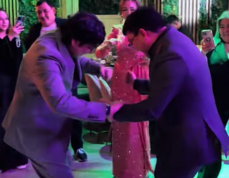 Видеода Мейрамбек пен Тоқтар бір-бірінің қолынан ұстап, жерді тепкілеп билеп жатқаны көрініс тапқан.