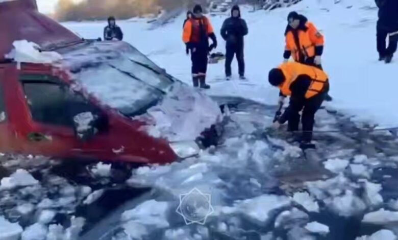 «Газель» жүк көлігі Шаған өзенінен өтпек болған, алайда мұз жүк тиелген көлік үшін жұқа болып шықты.