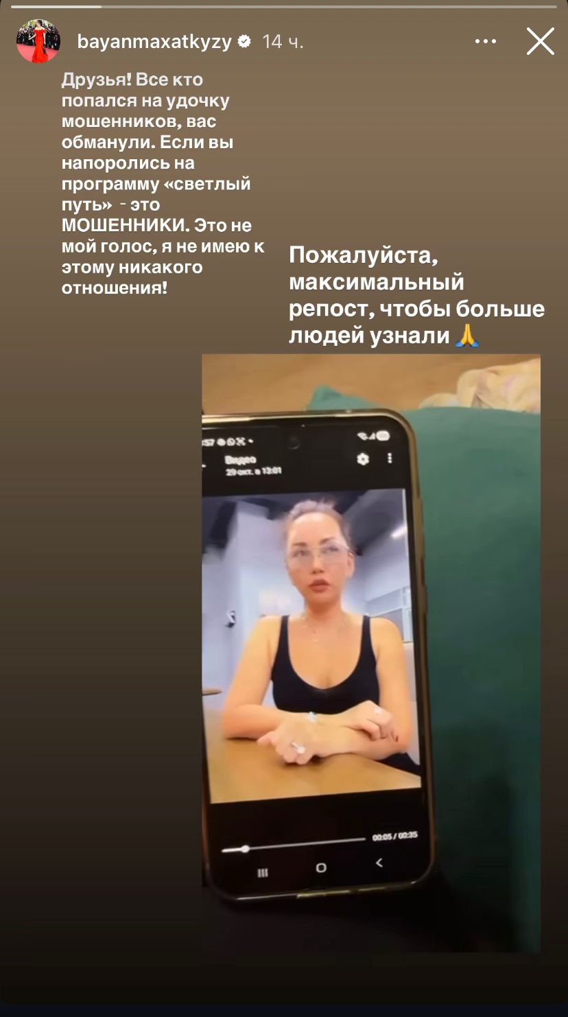 «Достар, егер сіздер алаяқтарға сеніп қалсаңыздар — онда алданып қалдыңыздар. «Светлый путь» бағдарламасының маған еш қатысы жоқ. Видеодағы дауыс — менікі емес», — деді ол.