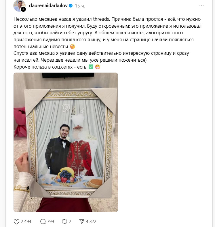 Танымал қазақстандық актер Даурен Айдарқұлов қазіргі жұбайымен танысу тарихын айтып берді – оларды Threads әлеуметтік желісі таныстырған, деп жазады qandastar.kz.