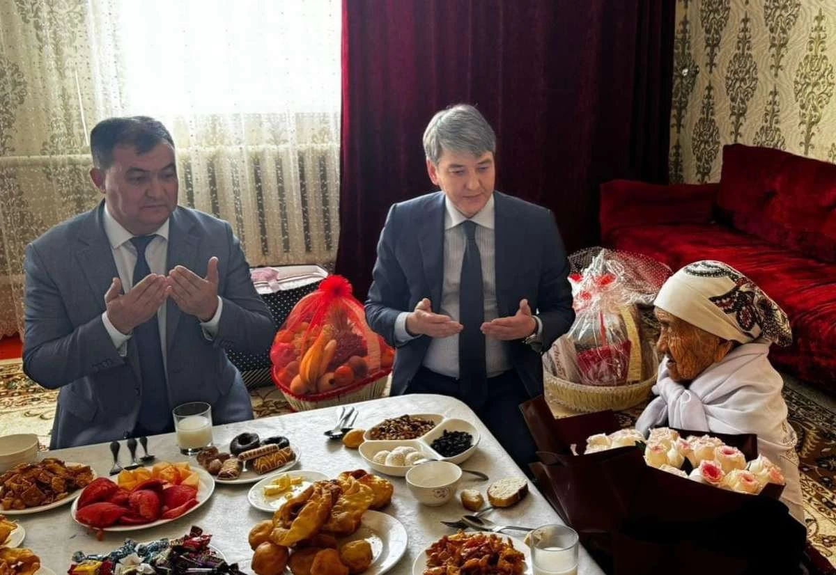 Әкім Арман Сәбитов ақ жаулықты әже Қызылкүл Қуандықованы 1 қазан – Халықаралық қарттар күні мерекесімен арнайы құттықтап барған екен.