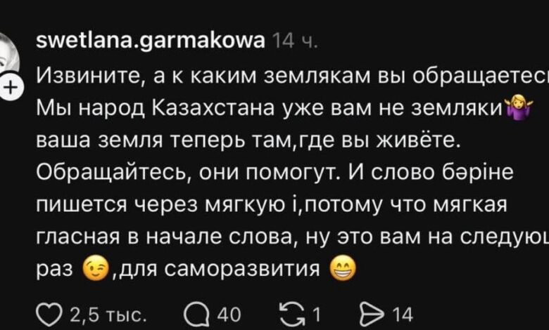 Журналист Кәмшат Тасболат әлеуметтік желідегі парақшасында этникалық және тілдік тақырыпқа қатысты өз пікірін бөлісті. Бұл туралы Qandastar.kz хабарлады.