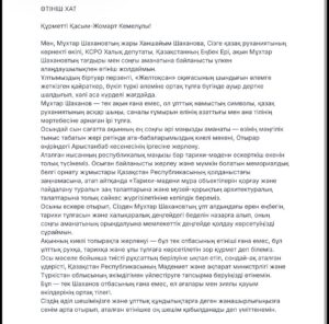 «Осыны ескере отырып, Сізден Мұхтар Шахановтың ұлт алдындағы ерен еңбегін, тарихи тұлғасын және халықаралық деңгейдегі беделін назарға алып, оның соңғы аманатының орындалуына мемлекеттік деңгейде қолдау көрсетуіңізді сұраймын.
